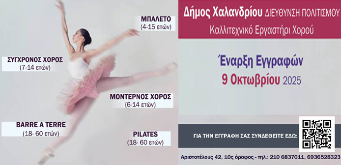 Από την Πέμπτη 9 Οκτωβρίου 2025 ξεκινούν οι ηλεκτρονικές αιτήσεις εγγραφής. στην πλατφόρμα https://demos365.chalandri.gr/, για τα μαθήματα του Εργαστηρίου Χορού του Δήμου Χαλανδρίου.