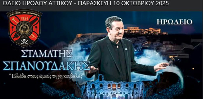 Την Παρασκευή 10 Οκτωβρίου, η Φιλαρμονική «Διονύσιος Σολωμός» της Ιερής Πόλης Μεσολογγίου θα συμμετάσχει στη μεγάλη συναυλία του Σταμάτη Σπανουδάκη στο Ωδείο Ηρώδου του Αττικού, στην Αθήνα