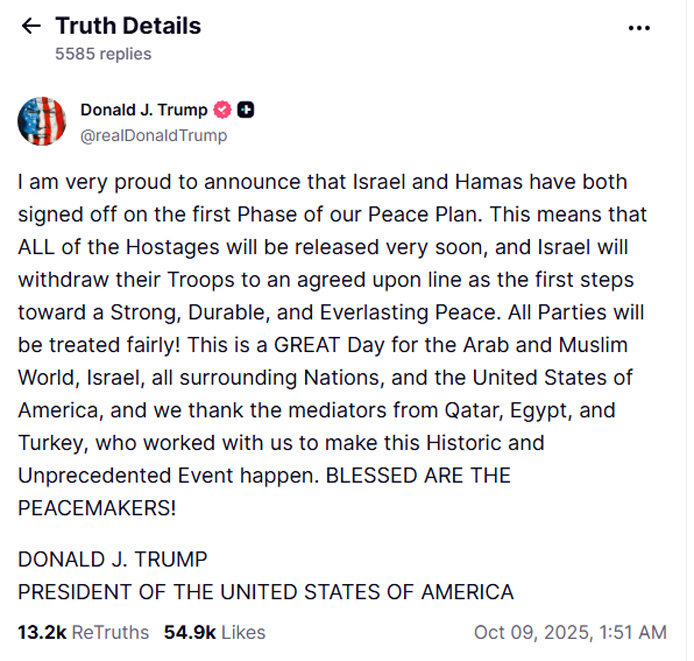 «Είμαι πολύ περήφανος που ανακοινώνω ότι το Ισραήλ και η Χαμάς υπέγραψαν την πρώτη φάση του ειρηνευτικού μας σχεδίου. Αυτό σημαίνει ότι ΟΛΟΙ οι όμηροι θα απελευθερωθούν πολύ σύντομα και το Ισραήλ θα αποσύρει τα στρατεύματά του σε μια συμφωνημένη γραμμή ως τα πρώτα βήματα προς μια Ισχυρή, Διαρκή και Αιώνια Ειρήνη. Όλα τα μέρη θα τύχουν δίκαιης μεταχείρισης! Αυτή είναι μια ΜΕΓΑΛΗ μέρα για τον αραβικό και μουσουλμανικό κόσμο, το Ισραήλ, όλα τα γύρω έθνη και τις Ηνωμένες Πολιτείες Αμερικής, και ευχαριστούμε τους μεσολαβητές από το Κατάρ, την Αίγυπτο και την Τουρκία, που συνεργάστηκαν μαζί μας για να πραγματοποιηθεί αυτό το ιστορικό και πρωτοφανές γεγονός. ΕΥΛΟΓΗΜΕΝΟΙ ΟΙ ΕΙΡΗΝΕΥΤΕΣ!