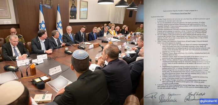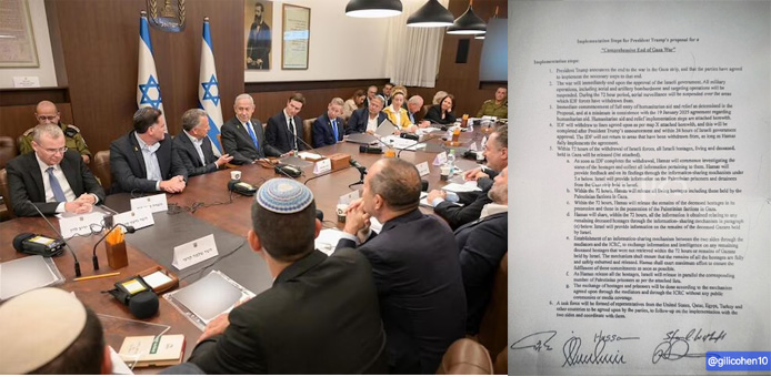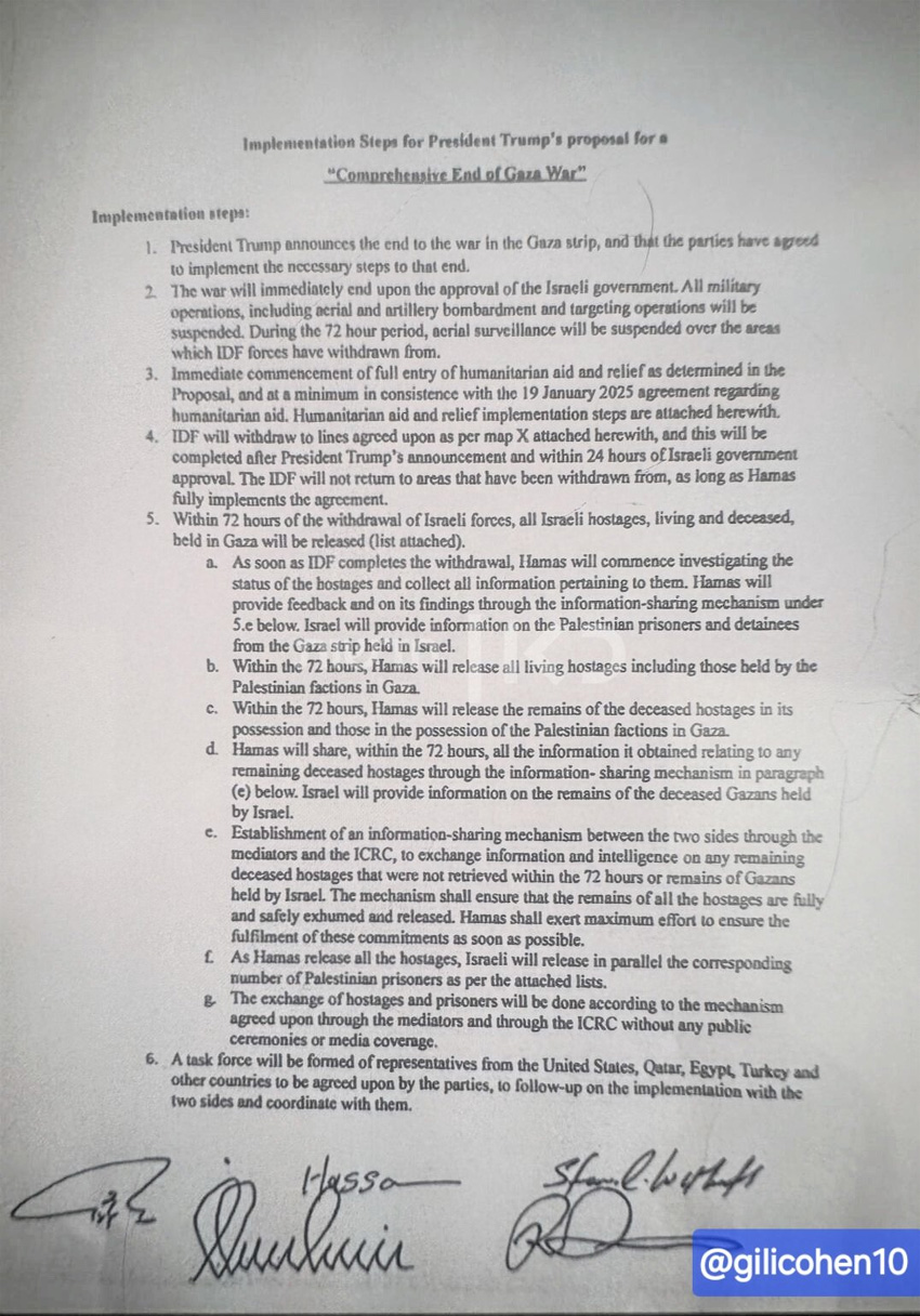 Η δημοσιογράφος Gili Cohen, του δημόσιου ραδιοτηλεοπτικού φορέα ΚΑΝΝ, αποκάλυψε το βράδυ της Πέμπτης ο έγγραφο της συμφωνίας που υπογράφηκε στην Αίγυπτο από το Ισραήλ, τη Χαμάς και τους μεσολαβητές, με τίτλο «Ολοκληρωμένος Τερματισμός του Πολέμου της Γάζας», για την απελευθέρωση των ομήρων και τον τερματισμό του πολέμου στη Γάζα.