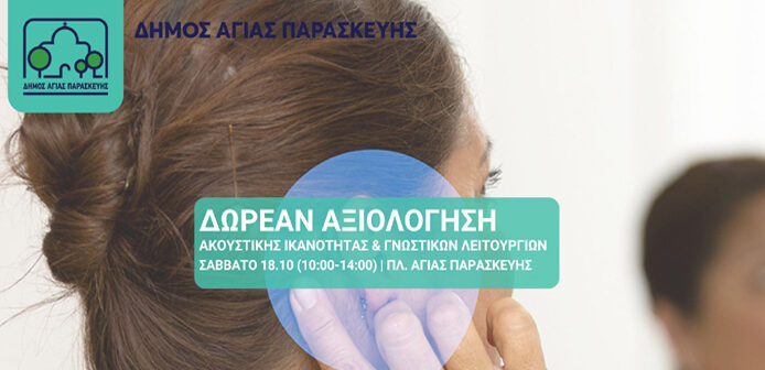 Ο Δήμος Αγίας Παρασκευής, στο πλαίσιο της διαρκούς μέριμνας για την υγεία και την ποιότητα ζωής των πολιτών, σε συνεργασία με την Acoustica Medica, διοργανώνει το Σάββατο 18 Οκτωβρίου από τις 10:00 έως τις 14:00, στην κεντρική πλατεία Αγίας Παρασκευής, δωρεάν σύντομες αξιολογήσεις ακουστικής ικανότητας.