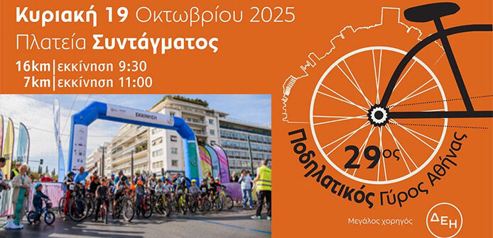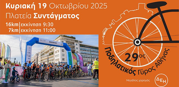 Ο Δήμος Αθηναίων δίνει το σύνθημα για μία μεγάλη γιορτή του αθλητισμού και της πόλης. Την Κυριακή 19 Οκτωβρίου 2025, η Αθήνα υποδέχεται τον 29ο Ποδηλατικό Γύρο, μια διοργάνωση του Οργανισμού Πολιτισμού, Αθλητισμού & Νεολαίας (ΟΠΑΝΔΑ), με την υποστήριξη της ΔΕΗ ως μεγάλου χορηγού.