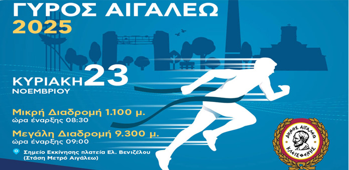 Ο Δήμος Αιγάλεω, σε συνδιοργάνωση με Αθλητικούς και Πολιτιστικούς Συλλόγους της πόλης και υπό την αιγίδα και τη χρηματοδότηση της Περιφέρειας Αττικής, διοργανώνει την Κυριακή 23 Νοεμβρίου 2025 τον καθιερωμένο αγώνα δρόμου «ΓΥΡΟΣ ΑΙΓΑΛΕΩ», μια γιορτή του μαζικού αθλητισμού και της συμμετοχής για όλες τις ηλικίες.
