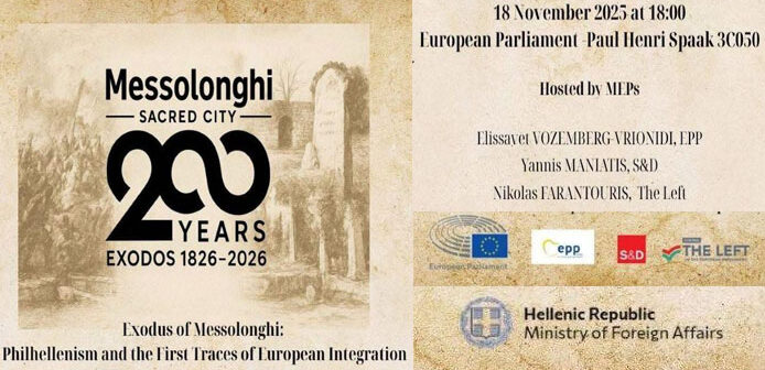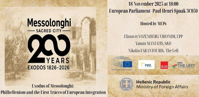 Το Ευρωπαϊκό Κοινοβούλιο τιμά τη Διακοσιοστή Επέτειο της Εξόδου του Μεσολογγίου με την εκδήλωση «Η Έξοδος του Μεσολογγίου: Ο Φιλελληνισμός και τα Πρώτα Ίχνη της Ευρωπαϊκής Ενοποίησης», η οποία θα πραγματοποιηθεί στις Βρυξέλλες την προσεχή Τρίτη, 18 Νοεμβρίου 2025 στις 19:00 (ώρα Ελλάδας).