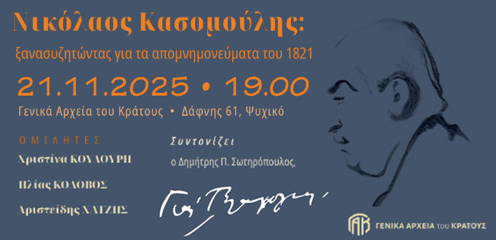 Τα Γενικά Αρχεία του Κράτους διοργανώνουν την Παρασκευή 21 Νοεμβρίου στις 19.00 στο κτήριο της Κεντρικής Υπηρεσίας (Δάφνης 61, Ψυχικό) εκδήλωση με τίτλο «Νικόλαος Κοσομούλης: ξανασυζητώνιας τα απομνημονεύματα του 1821», στο πλαίσιο των καθιερωμένων ετήσιων εκδηλώσεων τους προς τιμήν του Γιάννη Βλαχογιάννη.