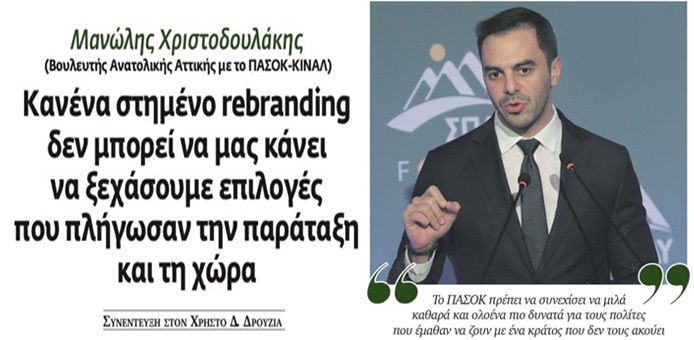 Κανένας στημένο rebranding δεν μπορεί να μας κάνει να ξεχάσουμε επιλογές που όχι μόνο πλήγωσαν την παράταξη,  αλλά πολύ περισσότερο πλήγωσαν τη χώρα και την ίδια την αριστερά, τονίζει στην εφημερίδα «Στο Καρφί» ο Μανώλης Χριστοδουλάκης, κληθείς να απαντήσει αν συμφωνεί με στελέχη του ΠΑΣΟΚ που λένε ναι σε διάλογο με τον Αλέξη Τσίπρα.