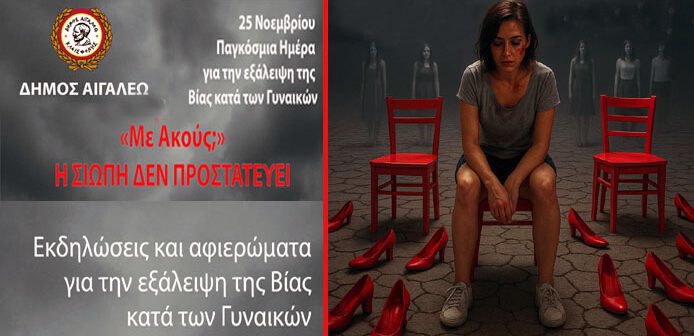 Ο Δήμος Αιγάλεω, με αφορμή την Παγκόσμια Ημέρα για την Εξάλειψη της Βίας κατά των Γυναικών, υλοποιεί μέσω της Διεύθυνσης Κοινωνικής Προστασίας το διεπιστημονικό πρόγραμμα κοινωνικής παρέμβασης «Με Ακούς; Η Σιωπή ως Τραύμα, ο Λόγος ως Θέση και Επιλογή», με στόχο την ευαισθητοποίηση και την ενεργοποίηση της τοπικής κοινωνίας απέναντι στο φαινόμενο της Έμφυλης Βίας.