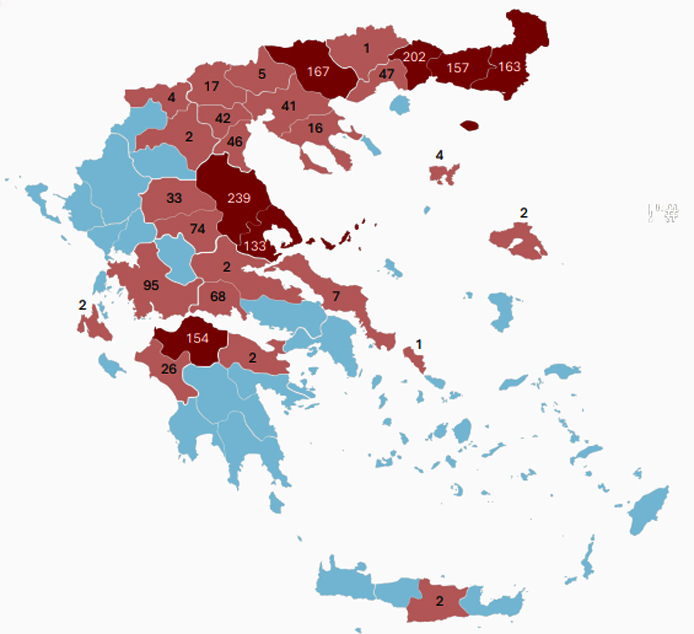 Σε ότι αφορά τα κρούσματα των τελευταίων ημερών, εκεί παρατηρούμε ότι πρωταθλητής είναι η Αιτωλοακαρνανία με 16 κρούσματα και ακολουθούν η Αχαΐα, η Ηλεία και οι Σέρρες με 6 η καθεμιά