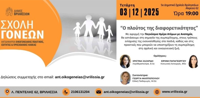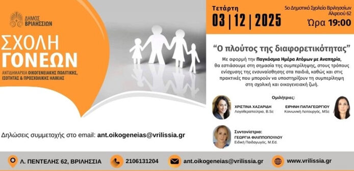 Αφιερωμένη στον «πλούτο της διαφορετικότητας» είναι η προσεχής συνάντηση της Σχολής Γονέων του Δήμου Βριλησσίων που θα πραγματοποιηθεί την Τετάρτη 03/12/2025 και ώρα 19:00 στο 5ο Δημοτικό Σχολείο Βριλησσίων (Αλφειού 62).