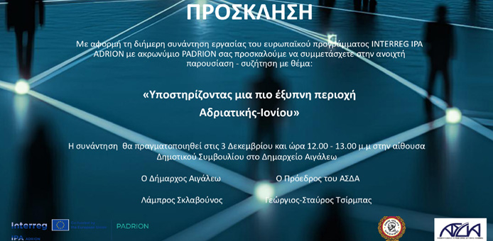 Ο Δήμος Αιγάλεω, σε συνεργασία με τον Αναπτυξιακό Σύνδεσμο Δυτικής Αττικής (ΑΣΔΑ), έχει την τιμή να φιλοξενήσει στις 2 & 3 Δεκεμβρίου 2025 την τρίτη δια ζώσης συνάντηση του έργου PADRION, που συνιστά ένα σημαντικό βήμα στο πλαίσιο των δράσεων για μια πιο έξυπνη και ψηφιακά συμπεριληπτική περιοχή της Αδριατικής–Ιονίου.