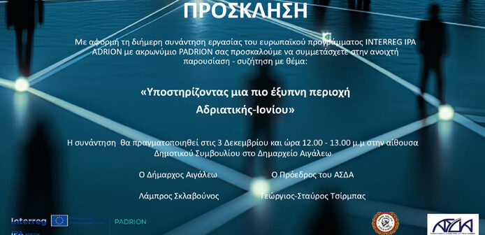 Ο Δήμος Αιγάλεω, σε συνεργασία με τον Αναπτυξιακό Σύνδεσμο Δυτικής Αττικής (ΑΣΔΑ), έχει την τιμή να φιλοξενήσει στις 2 & 3 Δεκεμβρίου 2025 την τρίτη δια ζώσης συνάντηση του έργου PADRION, που συνιστά ένα σημαντικό βήμα στο πλαίσιο των δράσεων για μια πιο έξυπνη και ψηφιακά συμπεριληπτική περιοχή της Αδριατικής–Ιονίου.