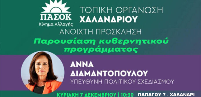 Η Υπεύθυνη Πολιτικού Σχεδιασμού του ΠΑΣΟΚ – Κινήματος Αλλαγής, Άννα Διαμαντοπούλου, παρουσιάζει το κυβερνητικό πρόγραμμα του ΠΑΣΟΚ στο Χαλάνδρι.