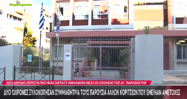 Στην Αγία Παρασκευή δύο μαθήτριες του 1ου Γυμνασίου, ηλικίας 13 ετών, φέρονται να εξύβρισαν και να ξυλοκόπησαν συμμαθήτρια τους, κατά τη διάρκεια του διαλείμματος.