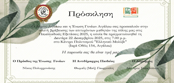 Ο Δήμος Αιγάλεω βραβεύει τους μαθητές και μαθήτριες της πόλης, που εισήχθησαν στα Ανώτατα Εκπαιδευτικά Ιδρύματα, κατά το Σχολικό Έτος 2024-2025