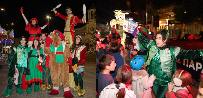 Συγκεκριμένα στην Κεντρική Πλατεία Αγίας Παρασκευής στήθηκε ένα εντυπωσιακό γιορτινό θέαμα, με ζογκλέρ, ξωτικά των μπαλονιών και επιβλητικούς ξυλοπόδαρους, που δημιούργησαν ένα παραμυθένιο χριστουγεννιάτικο σκηνικό και ξεσήκωσαν το κοινό.