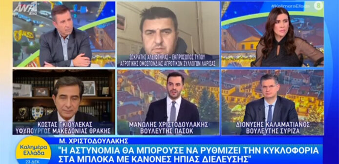 O Βουλευτής ΠΑΣΟΚ Ανατολικής Αττικής, Μανώλης Χριστοδουλάκης, βρέθηκε σήμερα στην εκπομπή «Καλημέρα Ελλάδα» του ΑΝΤ1, με τους δημοσιογράφους Παναγιώτη Στάθη και Άννα Λυβαθινού, όπου συζήτησαν για το αγροτικό ζήτημα, που δεν αφορά μόνο την κυκλοφορία στους δρόμους τις ημέρες των γιορτών, αλλά μια πραγματική μάχη επιβίωσης για τους αγρότες, με σοβαρές επιπτώσεις για τη διατροφική ασφάλεια της χώρας.