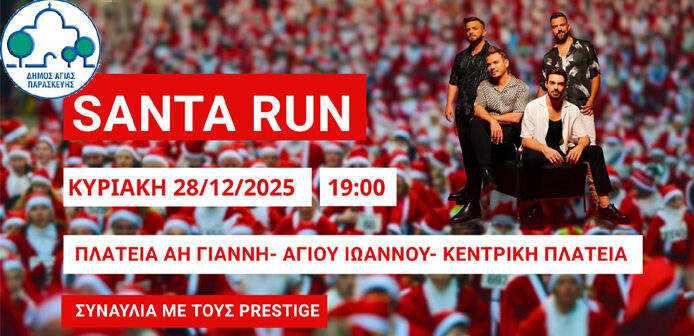 Ο Δήμος Αγίας Παρασκευής προσκαλεί μικρούς και μεγάλους στο πιο χαρούμενο και γιορτινό γεγονός της χρονιάς, το Santa Run, που θα πραγματοποιηθεί την Κυριακή 28 Δεκεμβρίου στις 19:00, και θα ολοκληρωθεί με μια μοναδική συναυλία από το συγκρότημα Prestige.