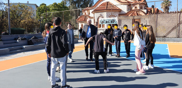 Ιδιαίτερα ξεχωριστή στιγμή αποτέλεσε η συνάντηση με μια παρέα μαθητών που βρίσκονταν στον χώρο. Ο Δήμαρχος και οι Αντιδήμαρχοι συνομίλησαν με τα παιδιά, άκουσαν με ενδιαφέρον τις σκέψεις και τα αιτήματά τους και, σε ένα ζεστό και αυθόρμητο κλίμα, αντάλλαξαν μαζί τους μερικές πασούλες στο γήπεδο μπάσκετ.