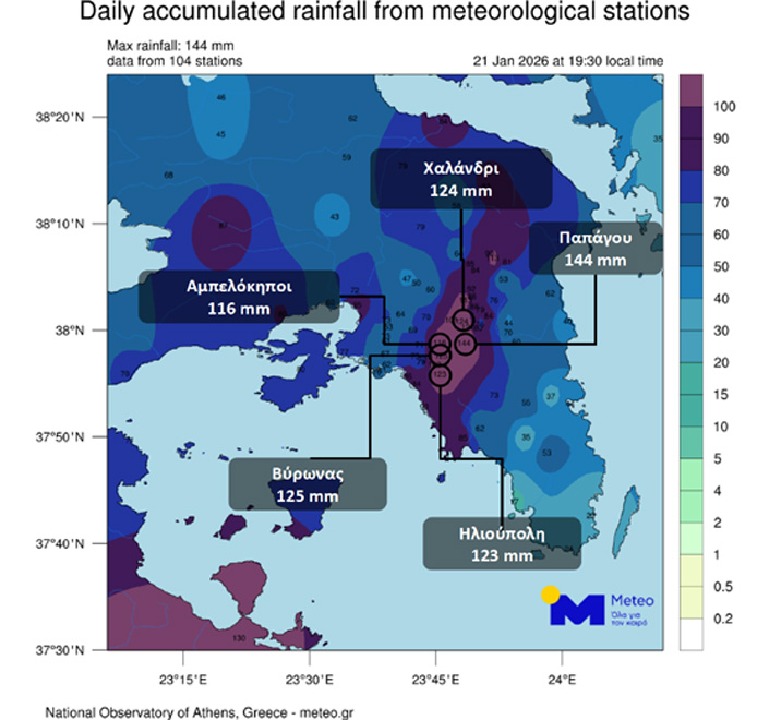 Πολύ μεγάλα ύψη βροχής καταγράφηκαν, σύμφωνα με το δίκτυο αυτόματων μετεωρολογικών σταθμών του Εθνικού Αστεροσκοπείου Αθηνών / Meteo.gr , από τις πρωινές ώρες της Τετάρτης 21/01 στην Αττική, την Ανατολική Πελοπόννησο, την Εύβοια, αλλά και σε άλλες περιοχές της χώρας. Τα μεγαλύτερα ύψη βροχής μέχρι τις 20:00 καταγράφηκαν στην περιοχή Παπάγου Αττικής με 146.4mm, ακολουθεί η Τακτικούπολη Τριζοινίας με 130.4mm και ο Βύρωνας Αττικής με 126.4mm όπως αποτυπώνεται στο Χάρτη 1.