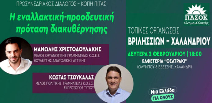 Οι Τοπικές Οργανώσεις ΠΑΣΟΚ – Κινήματος Αλλαγής Βριλησσίων & Χαλανδρίου, στα πλαίσια του Προσυνεδριακού Διαλόγου, διοργανώνουν πολιτική εκδήλωση με θέμα: «Η εναλλακτική – προοδευτική πρόταση διακυβέρνησης», τη Δευτέρα 2 Φεβρουαρίου 2026, ώρα 18:00, στην καφετέρια «ΘΕΑΤΡΑΚΙ», Ολύμπου & Εδέσσης, Χαλάνδρι.