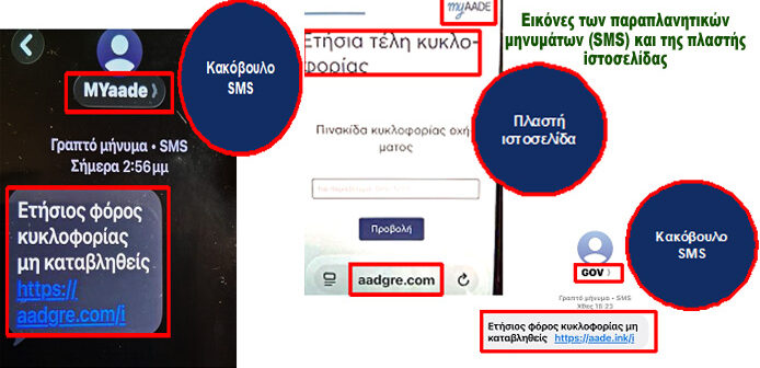 Τα μηνύματα αυτά, με την πρόφαση «μη καταβληθέντος ετήσιου φόρου κυκλοφορίας», ζητούν από τους παραλήπτες να πατήσουν σε σύνδεσμο (link) για να πληρώσουν δήθεν τέλη κυκλοφορίας οχημάτων.