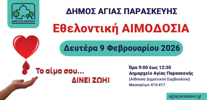 Ο Δήμος Αγίας Παρασκευής, σας προσκαλεί να συμμετάσχετε στην 86η Εθελοντική Αιμοδοσία, η οποία θα πραγματοποιηθεί τη Δευτέρα 9 Φεβρουαρίου , από τις 09:00 έως τις 12:30, στην Αίθουσα Δημοτικού Συμβουλίου, στο Δημαρχείο Αγίας Παρασκευής (Μεσογείων 415-417).