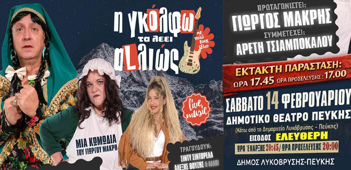 Ο Δήμος Λυκόβρυσης-Πεύκης προσκαλεί το κοινό στη διαδραστική κωμωδία του Γιώργου Μακρή: «Η Γκόλφω τα λέει αλλιώς», που θα παρουσιαστεί το Σάββατο 14 Φεβρουαρίου, στο Δημοτικό Θέατρο Πεύκης (κάτω από το Δημαρχείο Λυκόβρυσης – Πεύκης).