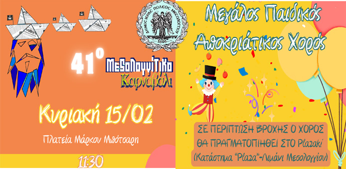 Ο Δήμος Ιεράς Πόλεως Μεσολογγίου προσκαλεί μικρούς και μεγάλους να συμμετάσχουν στον Μεγάλο Παιδικό Αποκριάτικο Χορό που διοργανώνεται στο πλαίσιο των εκδηλώσεων του 41ου Μεσολογγίτικου Καρναβαλιού.
