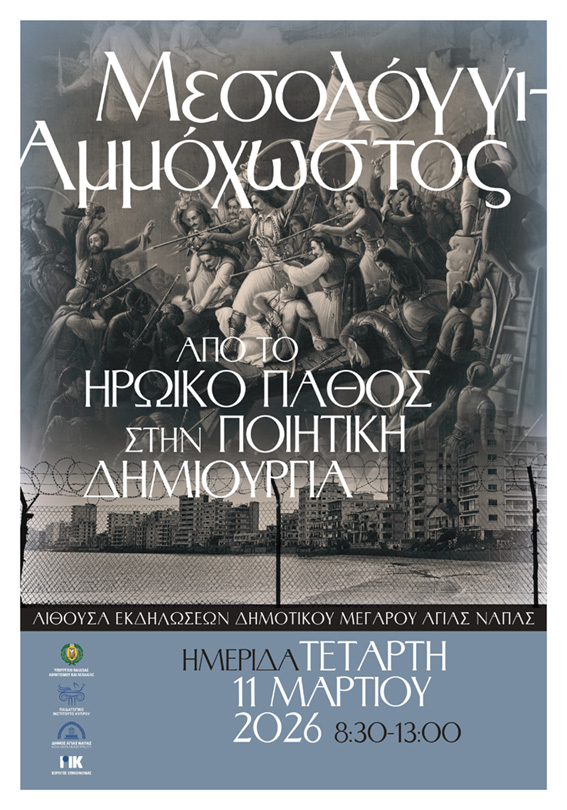 Αύριο Τετάρτη 11 Μαρτίου θα πραγματοποιηθεί στην Κύπρο ημερίδα με τίτλο «Μεσολόγγι – Αμμόχωστος: Από το Ηρωικό Πάθος στην Ποιητική Δημιουργία», στο πλαίσιο των εκδηλώσεων για τη Διακοσιοστή Επέτειο της Εξόδου του Μεσολογγίου.