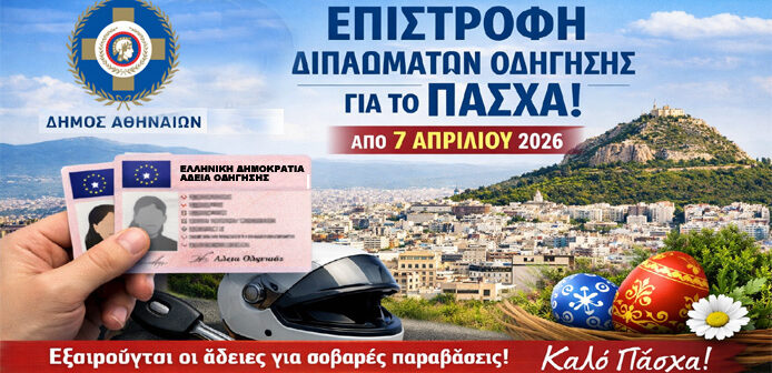 Ο Δήμος Αθηναίων δίνει τη δυνατότητα στους κατόχους αυτοκινήτων και μοτοσυκλετών, να παραλάβουν τις άδειες ικανότητας οδήγησης (διπλώματα) των οχημάτων τους από τις 7 Απριλίου 2026, οι οποίες είχαν αφαιρεθεί από τη Δημοτική Αστυνομία της Αθήνας, προκειμένου να διευκολυνθούν στις μετακινήσεις τους για το Πάσχα.