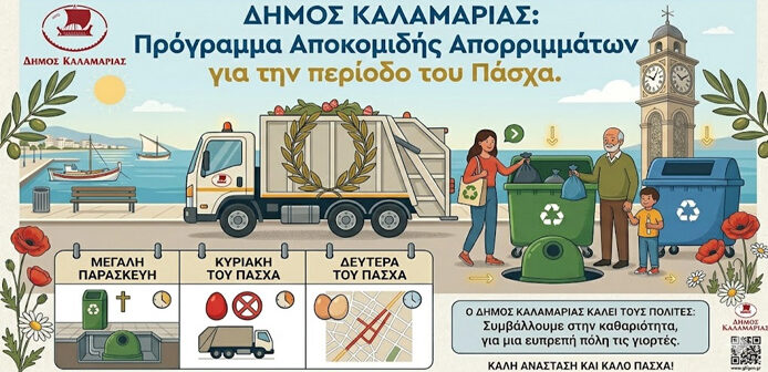 Ο Δήμος Καλαμαριάς ενημερώνει τους κατοίκους, τους επαγγελματίες και τους επισκέπτες της πόλης σχετικά με το πρόγραμμα αποκομιδής απορριμμάτων κατά την εορταστική περίοδο του Πάσχα.