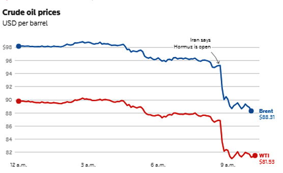 Οι τιμές είχαν ήδη μειωθεί νωρίτερα στη συνεδρίαση, καθώς οι πιθανές περαιτέρω συνομιλίες μεταξύ ΗΠΑ και Ιράν το Σαββατοκύριακο και μια 10ήμερη εκεχειρία μεταξύ Λιβάνου και Ισραήλ αύξησαν τις ελπίδες των επενδυτών ότι ο πόλεμος στη Μέση Ανατολή πλησιάζει στο τέλος του.