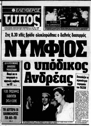Το πρωτοσέλιδο της φωτογραφίας είναι από την εφημερίδα “Ελεύθερος Τύπος” εκείνης της περιόδου, που στήριζε τη ΝΔ. Το πόσα χυδαία πρωτοσέλιδα είχε κάνει αυτή η εφημερίδα κι οι υπόλοιπες που στήριζαν τη ΝΔ, τότε, δεν μετριούνται. Στόχος η φυσική εξόντωση του Ανδρέα, αφού δεν μπορούσαν την πολιτική του.