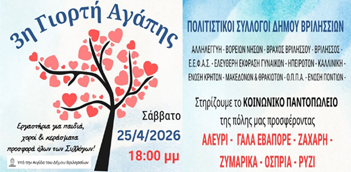 Μια σημαντική πρωτοβουλία αλληλεγγύης και κοινωνικής προσφοράς αναλαμβάνουν οι Πολιτιστικοί Σύλλογοι Βριλησσίων, οι οποίοι, υπό την αιγίδα του Δήμου Βριλησσίων, ενώνουν τις δυνάμεις τους για τη διοργάνωση της «3ης Γιορτής Αγάπης», το Σάββατο 25 Απριλίου 2026, στην Πλατεία Ανάληψης.