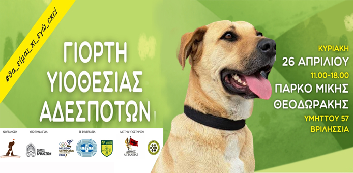 Την Κυριακή 26 Απριλίου 2026 11 το πρωί με 6:00 το απόγευμα τα σκυλάκια του Φιλοζωικού συλλόγου Αιγιάλειας «Τα φιλαράκια» θα σας περιμένουν με χαρούμενες ουρίτσες στο Πάρκο Μίκης Θεοδωράκης (πρ. ΤΥΠΕΤ) στα Βριλήσσια.