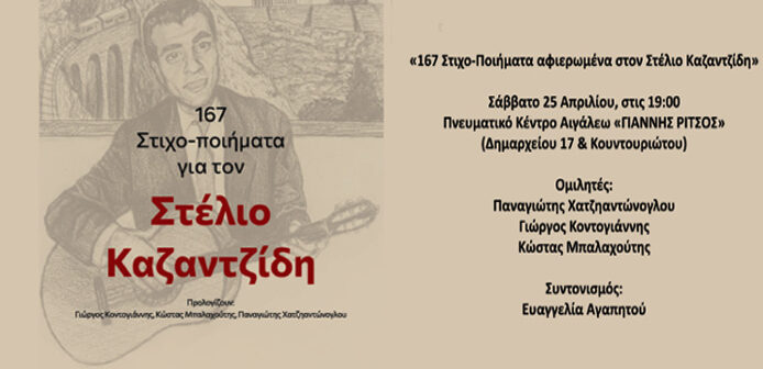 Μια ξεχωριστή μουσικο-ποιητική βραδιά στο Πνευματικό Κέντρο Αιγάλεω «ΓΙΑΝΝΗΣ ΡΙΤΣΟΣ» τιμή στον θρυλικό Στέλιο Καζαντζίδη μέσα από λόγο, μουσική και σύγχρονη δημιουργία.