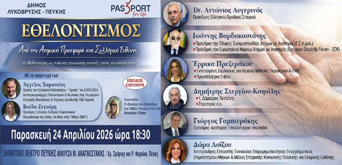 Ο Δήμος Λυκόβρυσης – Πεύκης, σε συνεργασία με την ΑΜΚΕ Passport for Life, διοργανώνουν εσπερίδα αφιερωμένη στον εθελοντισμό, την Παρασκευή 24 Απριλίου 2026 και ώρα 18:30, στο Δημοτικό Θέατρο Πεύκης (Αίθουσα «Μ. Αναγνωστάκης», ισόγειο).