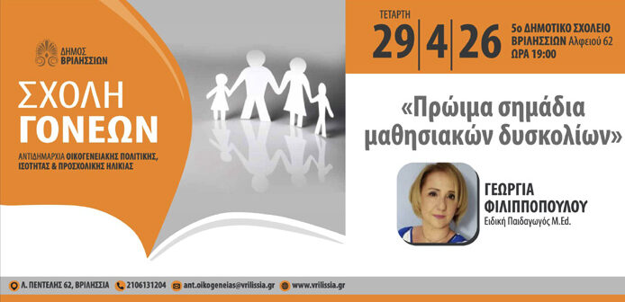 Σχολή Γονέων Βριλησσίων: «Πρώιμα σημάδια μαθησιακών δυσκολιών» την Τετάρτη 29/4 στο 5ο Δημοτικό