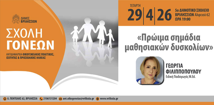Αφιερωμένη στα πρώιμα σημάδια των μαθησιακών δυσκολιών είναι η προσεχής συνάντηση της Σχολής Γονέων της Αντιδημαρχίας Οικογενειακής Πολιτικής, Ισότητας και Προσχολικής Ηλικίας του Δήμου Βριλησσίων, η οποία θα πραγματοποιηθεί σήμερα, Τετάρτη 29 Απριλίου και ώρα 19:00, στο 5ο Δημοτικό Σχολείο Βριλησσίων.