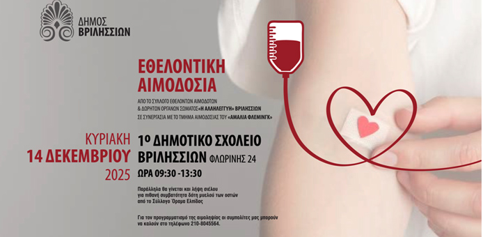 Βριλήσσια: Εθελοντική Αιμοδοσία την Κυριακή 14/12/2025