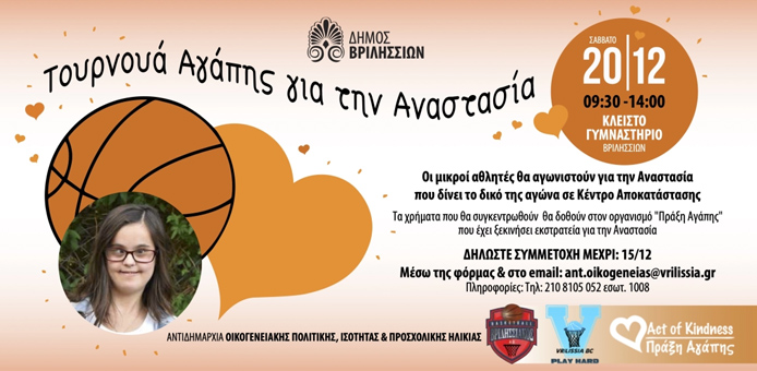 Βριλήσσια: Τουρνουά Αγάπης για την Αναστασία- στο Κλειστό Γυμναστήριο