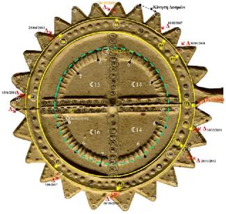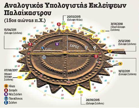 Η εντυπωσιακÞ αποκÜλυψη του κ. ΤσικριτσÞ Ο ακτινωτüς δßσκος του 15ου αιþνα π.Χ. χωρßζεται σε δýο ημικýκλια, που το καθÝνα Ýχει 29 και 30 χαρÜξεις. ΑυτÜ τα ημικýκλια αναπαριστοýν δýο σεληνιακοýς μÞνες 29,5 ημερþν, που αρχßζουν και τελειþνουν με πανσÝληνο. Αν, κÜθε μÝρα, μετακινεßται δεξιüστροφα μßα βελüνα στον εσωτερικü κýκλο (της ΣελÞνης) και κÜθε δýο μÞνες μετακινεßται μßα Üλλη βελüνα με τον ßδιο τρüπο στην περιφÝρεια με τα ακτινωτÜ τριγωνικÜ δüντια που Ýχουν 112 τρýπες, τüτε καταγρÜφεται η πορεßα της ΣελÞνης ως προς τη θÝση των δεσμþν.Η πορεßα του ¹λιου καταγρÜφεται στον κýκλο της περιφÝρειας του Δßσκου με κßνηση αντßθετη απü την κßνηση της ΣελÞνης, þστε κÜθε περßπου 6 μÝρες να κινεßται μßα θÝση. Αν συνÝπιπτε ο ¹λιος να εßναι κοντÜ σ’ Ýνα δεσμü και η ΣελÞνη σε πανσÝληνο Þ νÝα ΣελÞνη τüτε Ýχουμε Ýκλειψη. «Οι Μινωßτες γνþριζαν για το φυσικü φαινüμενο που ονομÜζεται “ΣÜρος”», αναφÝρει ο κ. ΤσικριτσÞς και εξηγεß πως «πρüκειται για το γεγονüς üτι οι εκλεßψεις επαναλαμβÜνονται με την ßδια σειρÜ κÜθε 18,5 σεληνιακÜ χρüνια».