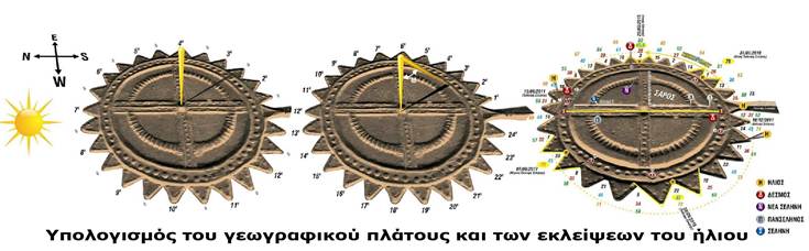 Εξηγþντας ο κ. ΤσικριτσÞς τη χρÞση του μηχανισμοý για τον υπολογισμü του γεωγραφικοý πλÜτους, τονßζει üτι «αν ο χρÞστης του δßσκου χρησιμοποιοýσε ως üργανα, μßα βελüνα και μßα λαβßδα, που υπÜρχουν στο αποτýπωμα του πλακιδßου και σημεßωνε ανÜ δýο εβδομÜδες την Üκρη της σκιÜς üταν μεσουρανεß ο ¹λιος, τüτε θα μποροýσε με την γωνßα «ω» να καταγρÜφει το γεωγραφικü πλÜτος του τüπου που βρßσκεται. ¸τσι σε μελλοντικÞ απομÜκρυνση του απü τον τüπο του στο βορρÜ, βρßσκοντας τη γωνßα απüκλισης τοý τüπου του θα μποροýσε, παρατηρþντας τη σκιÜ της βελüνας, την αντßστοιχη εβδομÜδα, να προσδιορßσει πüσο βüρεια κατευθýνθηκε, þστε να μπορεß να επιστρÝψει».