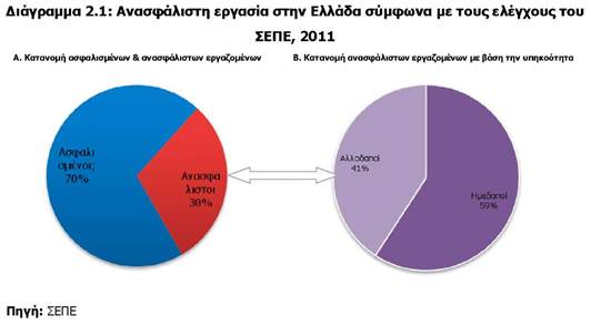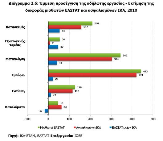 Στην ΕλλÜδα καταγρÜφεται πιο Ýντονα, συγκριτικÜ με Üλλες χþρες, η ανÜπτυξη μιας δευτερεýουσας αγορÜς εργασßας με αντßστοιχα χαρακτηριστικÜ üπως της επßσημης, στην οποßα üμως εßναι ιδιαßτερα διαδεδομÝνο το φαινüμενο της αδÞλωτης απασχüλησης. Η αδÞλωτη εργασßα παρατηρεßται, σýμφωνα με επßσημα στοιχεßα και σε δραστηριüτητες σχετικÝς με το τουριστικü προúüν. Η αδÞλωτη εργασßα, η οποßα στους ελÝγχους του Σþματος Επιθεþρησης Εργασßας ανÞλθε στο 30% το 2011 συνδÝεται με την ανÜπτυξη της παραοικονομßας, ενþ εκδηλþνεται με μεγαλýτερη Ýνταση σε οικονομßες που χαρακτηρßζονται απü υψηλÜ ποσοστÜ ανεργßας και αυτοαπασχüλησης, αλλÜ και σημαντικÝς μεταναστευτικÝς ροÝς, χαρακτηριστικÜ δηλαδÞ που συναντþνται στην ελληνικÞ αγορÜ εργασßας. Η εμπειρικÞ ανÜλυση της αδÞλωτης εργασßας εßναι ιδιαßτερα δýσκολη, καθþς η πληροφορßα σχετικÜ με το σýνολο των ωρþν που εργÜζεται το Üτομο που συμμετÝχει στην ανεπßσημη αγορÜ εργασßας εßναι σχεδüν αδýνατο να προσδιοριστεß. Μια Ýμμεση üμως μÝθοδος η οποßα βασßζεται στην πιθανÝς αποκλßσεις που εμφανßζουν τα στατιστικÜ στοιχεßα απü διαφορετικÝς πηγÝς δεδομÝνων μπορεß να ερμηνευτεß, σýμφωνα με τη βιβλιογραφßα, ως Ýνδειξη εκδÞλωσης του φαινομÝνου. Απü τη σýγκριση μεταξý του αριθμοý των ασφαλισμÝνων στο ΙΚΑ και των μισθωτþν απü την Ýρευνα Εργατικοý Δυναμικοý σε κýριους κλÜδους οικονομικÞς δραστηριüτητας, προκýπτει üτι η μεγαλýτερη απüκλιση ανÜμεσα στις δýο πηγÝς στατιστικþν στοιχεßων καταγρÜφεται στις κατασκευÝς, στον πρωτογενÞ τομÝα, στη μεταποßηση και στην εστßαση. Η αδÞλωτη εργασßα προσεγγßζεται επßσης απü το μÝγεθος της αυτοαπασχüλησης συμπεριλαμβανομÝνων και των συμβοηθοýντων μελþν στην οικογενειακÞ επιχεßρηση, καθþς οι εργασιακÝς σχÝσεις σε αυτÞ τη μορφÞ απασχüλησης βασßζονται συνÞθως σε προσωπικü Þ συγγενικü επßπεδο με σκοπü τον πιο Üμεσο Ýλεγχο της παραγωγÞς και των üρων αμοιβÞς τους. Εßναι χαρακτηριστικü üτι στην ΕλλÜδα το ποσοστü των βοηθþν στην οικογενειακÞ επιχεßρηση -οι οποßοι αποκομßζουν εισüδημα απü την εργασßα που προσφÝρουν αλλÜ συνÞθως δεν καταβÜλλουν εισφορÝς ασφÜλισης, ανÝρχεται στο 5% της συνολικÞς απασχüλησης το 2011 -το υψηλüτερο στην ευρωζþνη. Οι κλÜδοι οικονομικÞς δραστηριüτητας με το μεγαλýτερο ποσοστü εßναι ο πρωτογενÞς τομÝας (18% της συνολικÞς απασχüλησης) και η εστßαση (13%), ενþ ελαφρþς υψηλüτερο του μÝσου üρου στο σýνολο της οικονομικÞς δραστηριüτητας εßναι στο εμπüριο (7%), στα Καταλýματα (6%) και στη Μεταποßηση (5%). Απü την Üλλη πλευρÜ, το ýψος της αυτοαπασχüλησης στην ΕλλÜδα εßναι διπλÜσιο ως ποσοστü (31%) απü το μÝσο üρο της ευρωζþνης με τον πρωτογενÞ τομÝα να αποτελεß την κατεξοχÞν οικονομικÞ δραστηριüτητα στην οποßα εμφανßζεται ο τýπος αυτüς απασχüλησης. Υψηλü εßναι επßσης το μÝγεθος της αυτοαπασχüλησης στα ΕπιστημονικÜ-ΤεχνικÜ επαγγÝλματα (δικηγüροι, λογιστÝς, σýμβουλοι επιχειρÞσεων, αρχιτÝκτονες, επιστημονικÞ Ýρευνα κ.Ü.), καθþς 2 στους 3 σχεδüν εργÜζονται με αυτÞ τη μορφÞ απασχüλησης, σε αντßθεση με τις υπηρεσßες καταλýματος που κýρια μορφÞ απασχüλησης εßναι η μισθωτÞ εργασßα (σχεδüν 3 στους 4 εργαζüμενους). Η αδÞλωτη εργασßα προκαλεß σημαντικÝς απþλειες για τους ασφαλιστικοýς οργανισμοýς της χþρας, καθþς συνεπÜγεται τη σημαντικÞ δυσκολßα στη χρηματοδüτησÞ τους. Η αρνητικÞ αυτÞ επßδραση επιβαρýνεται απü την ανοδικÞ πορεßα της ανεργßας, αλλÜ και απü την φýση της οικ
