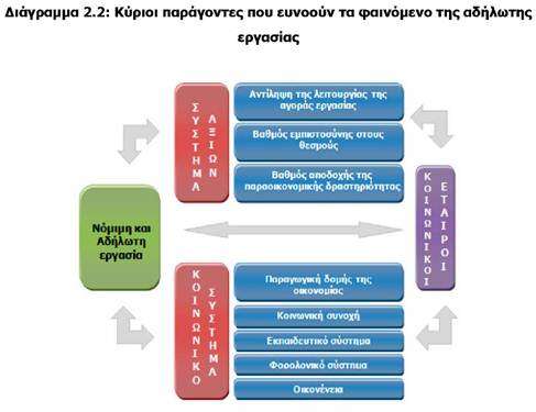 Κýριες αιτßες εκδÞλωσης της αδÞλωτης εργασßας Το φαινüμενο της αδÞλωτης εργασßας εßναι πολυσýνθετο και επηρεÜζεται απü Ýνα ευρýτερο φÜσμα οικονομικþν, κοινωνικþν, πολιτικþν και θεσμικþν παραγüντων. Στους θεσμικοýς παρÜγοντες ως κυριüτεροι επισημαßνονται η χαμηλÞ εμπιστοσýνη στην οργÜνωση του κρÜτους και στο πολιτικü σýστημα, οι ισχυροß οικογενειακοß δεσμοß και η θετικÜ προσκεßμενη συμπεριφορÜ προς την ανασφÜλιστη εργασßα. Αντßστοιχα, ως κυριüτεροι πολιτικοß παρÜγοντες για την εμφÜνιση του φαινομÝνου προβÜλλονται το ανεπαρκÝς κοινωνικü κρÜτος (πχ χαμηλÜ κοινωνικÜ επιδüματα), το ýψος της φορολογßα και των ασφαλιστικþν εισφορþν, ενþ στους κυριüτερους κοινωνικοýς-οικονομικοýς παρÜγοντες εντÜσσονται η παραγωγικÞ δομÞ της οικονομßας και το μÝγεθος της παραοικονομßας .