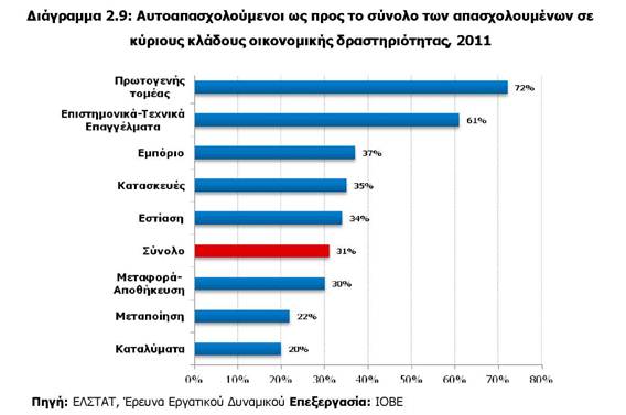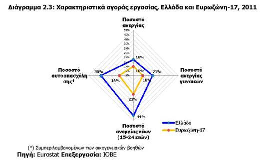 Η ανεργßα πλÞττει σε μεγαλýτερο βαθμü τις γυναßκες και τους νÝους (ιδιαßτερα στην ηλικιακÞ ομÜδα των 15 Ýως 24 ετþν), με το αντßστοιχο ποσοστü να κυμαßνεται σε διπλÜσιο επßπεδο απü εκεßνο στην ευρωζþνη. Απü την Üλλη πλευρÜ, η αυτοαπασχüληση ως μορφÞ εργασßας συναντÜται σε πολλοýς κλÜδους της εγχþριας οικονομικÞς δραστηριüτητας, με την αναλογßα στο σýνολο των απασχολοýμενων να εßναι η μεγαλýτερη στις χþρες-μÝλη της ΕΕ (36%, ΔιÜγραμμα 2.3).