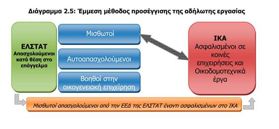 Τρüποι προσÝγγισης της αδÞλωτης εργασßας Η αδÞλωτη εργασßα λαμβÜνει διÜφορες μορφÝς, üπως η συμμετοχÞ στη δευτερεýουσα αγορÜ εργασßας (εξ ολοκλÞρου εßτε παρÜλληλα με τη συμμετοχÞ στην επßσημη αγορÜ εργασßας) Þ η απασχüληση ατüμων που δεν μποροýν να συμμετÝχουν στην επßσημη αγορÜ εργασßας (πχ παρÜνομοι μετανÜστες). Για το λüγο αυτü, η εμπειρικÞ ανÜλυση της αδÞλωτης εργασßας εßναι ιδιαßτερα δýσκολη, δεδομÝνου üτι το σýνολο των ωρþν που εργÜζεται το Üτομο που συμμετÝχει στην ανεπßσημη αγορÜ εργασßας εßναι σχεδüν αδýνατο να προσδιοριστεß. Στη βιβλιογραφßα για την παραοικονομικÞ δραστηριüτητα προτεßνονται διÜφορες μÝθοδοι προσÝγγισης του φαινομÝνου, üπως η δειγματοληπτικÞ Ýρευνα σε Üτομα και νοικοκυριÜ (Üμεσος τρüπος εκτßμησης) Þ η ανÜπτυξη υποδειγμÜτων για την ποσοτικÞ εκτßμησÞ της. Ακολουθοýνται επßσης Ýμμεσες μÝθοδοι, σýμφωνα με τις οποßες ορισμÝνα μεγÝθη ερμηνεýονται ως ενδεßξεις εκδÞλωσης του φαινομÝνου. Οι κυριüτερες βασßζονται σε πιθανÝς αποκλßσεις που εμφανßζουν τα στατιστικÜ στοιχεßα απü διαφορετικÝς πηγÝς δεδομÝνων.¼σον αφορÜ στην αγορÜ εργασßας, μια προσÝγγιση αυτοý του τýπου στηρßζεται στη σýγκριση της απασχüλησης απü δειγματοληπτικÝς και απογραφικÝς Ýρευνες, üπως για παρÜδειγμα της ¸ρευνας Εργατικοý Δυναμικοý (δειγματοληπτικÞ) και των στατιστικþν στοιχεßων απü ασφαλιστικοýς οργανισμοýς (απογραφικÞ) οι οποßοι καταγρÜφουν τον αριθμü των εργαζομÝνων για τους οποßους καταβÜλλονται εισφορÝς ασφÜλισης απü τις επιχειρÞσεις που τους απασχολοýν. Σε μια δειγματοληπτικÞ Ýρευνα η μÝση εκτßμηση του πληθυσμοý κατÜ κατÜσταση απασχüλησης (απασχολοýμενοι, Üνεργοι, μη οικονομικÜ ενεργοß κ.ο.κ) προκýπτει απü αναγωγÞ των δεδομÝνων που συλλÝγονται. Με βÜση τη συγκεκριμÝνη Ýμμεση μÝθοδο, η διαφορÜ που ενδεχομÝνως προκýπτει απü την εκτßμηση της απασχüλησης με δειγματοληψßα σε σýγκριση με καταγεγραμμÝνα στοιχεßα για εργαζüμενους (απü Ýναν ασφαλιστικü οργανισμü για παρÜδειγμα) αποδßδεται εν μÝρει και στην ýπαρξη αδÞλωτης εργασßας. Στο πλαßσιο αυτü, λαμβÜνονται στοιχεßα απασχüλησης απü την ¸ρευνα Εργατικοý Δυναμικοý της ΕΛΣΤΑΤ και απü το ºδρυμα ΚοινωνικÞς ΑσφÜλισης (ΙΚΑ-ΕΤΑΜ). Η Ýρευνα εργατικοý δυναμικοý (ΕΕΔ) πραγματοποιεßται στον πληθυσμü των ιδιωτικþν νοικοκυριþν με σκοπü την παροχÞ συγκρßσιμων στατιστικþν στοιχεßων για την απασχüληση και την ανεργßα στις χþρες- μÝλη της ΕΕ και οι εκτιμÞσεις της αφοροýν στην κýρια απασχüληση (üχι δηλαδÞ την απασχüληση με βÜση των αριθμü των θÝσεων εργασßας). Αντßστοιχα, στα μηνιαßα στοιχεßα του ΙΚΑ δημοσιεýεται ο αριθμüς των ασφαλισμÝνων, üπως προκýπτει απü τις ΑναλυτικÝς ΠεριοδικÝς Δηλþσεις που υποβÜλλουν οι επιχειρÞσεις που απασχολοýν Üτομα που ασφαλßζονται στον Οργανισμü. ΔεδομÝνου üτι οι ασφαλισμÝνοι στο ΙΚΑ εργÜζονται κατÜ κýριο λüγο με σχÝση εξαρτημÝνης εργασßας (δηλαδÞ μισθωτÞ εργασßα)3 και προκειμÝνου τα στοιχεßα να εßναι (στο μεγαλýτερο δυνατü βαθμü) συγκρßσιμα με εκεßνα της ΕΛΣΤΑΤ, λαμβÜνεται απü την ¸ρευνα Εργατικοý Δυναμικοý ο αριθμüς των μισθωτþν απασχολοýμενων ο οποßος προκýπτει απü την ανÜλυση της απασχüλησης ως προς τη θÝση στο επÜγγελμα (ΔιÜγραμμα 2.5).