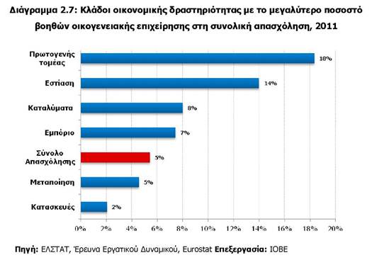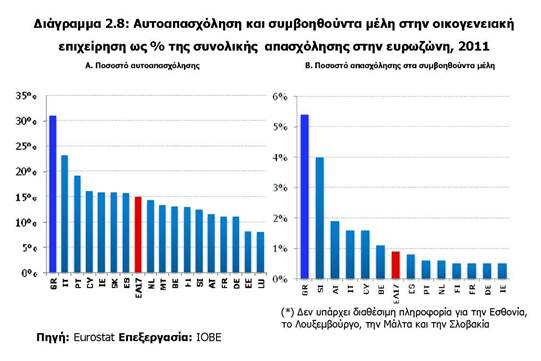 Στην περßπτωση αυτÞ η οργÜνωση της επιχειρηματικÞς δραστηριüτητας εßναι πιο χαλαρÞ, η απασχüληση εßναι σε αρκετÝς περιπτþσεις εποχιακÞ και εντÜσεως εργασßας, ενþ παρατηρεßται η τÜση τα Üτομα να ενισχýουν το εισüδημÜ τους και μÝσα απü τη μη καταβολÞ φüρων και εισφορþν. Με τον üρο βοηθοß στην οικογενειακÞ επιχεßρηση, περιγρÜφονται τα Üτομα που εργÜζονται στις επιχειρÞσεις των γονÝων τους, αποκομßζοντας εισüδημα για την εργασßα την οποßα προσφÝρουν. Ωστüσο, στην πλειοψηφßα τους τα συμβοηθοýντα μÝλη δεν καταβÜλλουν εισφορÝς ασφÜλισης (εκτüς απü ορισμÝνες περιπτþσεις και σε περιοχÝς με μικρü πληθυσμü6), με συνÝπεια να μην αποτυπþνεται η απασχüλησÞ τους στα στατιστικÜ στοιχεßα ασφαλιστικþν οργανισμþν. Στην ΕλλÜδα το 2011, οι απασχολοýμενοι ως βοηθοß στην οικογενειακÞ επιχεßρηση ανÞλθαν σε 222 χιλ. Þ 5% του συνüλου των απασχολουμÝνων της χþρας, üταν ο αντßστοιχος μÝσος üρος στην ευρωζþνη δεν ξεπερνÜ το 1% (ΔιÜγραμμα 2.8B).