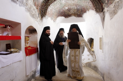 ΩΡΑ 09.55 Ο Πατριάρχης εισέρχεται στο καθολικό της μονής που κοσμείται με περίφημες τοιχογραφίες και ενεδύεται την αρχιερατική στολή.