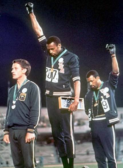 Μεξικό 1968 Οι Αφρο-αμερικανοί Ολυμπιονίκες Tommie Smith (κέντρο) και John Carlos (δεξιά), κατά την βράβευσή τους κι ενώ ακούγεται ο εθνικός ύμνος των Η.Π.Α., υψώνουν τη γροθιά τους φορώντας μαύρα γάντια, θέλοντας έτσι να διαμαρτυρηθούν για τις φυλετικές διακρίσεις που υφίστανται στη χώρα τους. Ο έτερος Αυστραλός συναθλητής τους, Peter Norman, συμπαρίσταται, φορώντας ένα διακριτικό του Ολυμπιακού Σχεδίου για τα Ανθρώπινα Δικαιώματα και είναι αυτός που πρότεινε στους συναθλητές του να φορέσουν από ένα γάντι. Μετά την κίνηση αυτή, οι 2 αθλητές αποβλήθηκαν από τους Ολυμπιακούς Αγώνες και την Ολυμπιακή ομάδα των Η.Π.Α., ενώ λέγεται ότι τους αφαιρέθηκαν και τα μετάλλια (διαψεύστηκε από τον Carlos).
